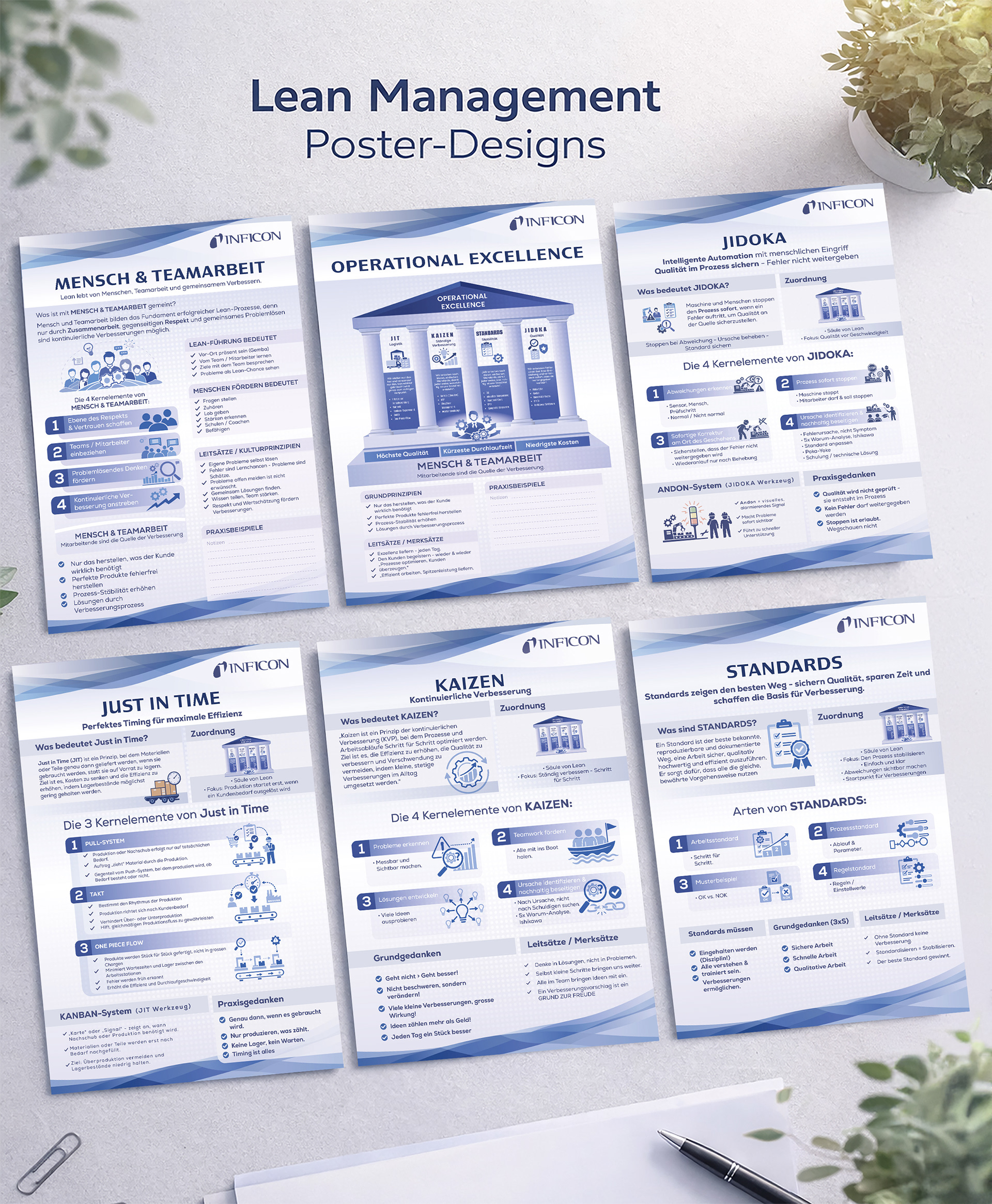 Six educational posters designed to communicate complex Lean management principles in a clear and visually structured way. The project focuses on transforming abstract process concepts into easy-to-understand visual systems using consistent layouts, iconography, and a restrained color palette. Each poster is part of a cohesive series, ensuring strong visual consistency while allowing each topic to stand on its own. The result is a clean, modern poster set suitable for training environments, workshops, and internal communication.